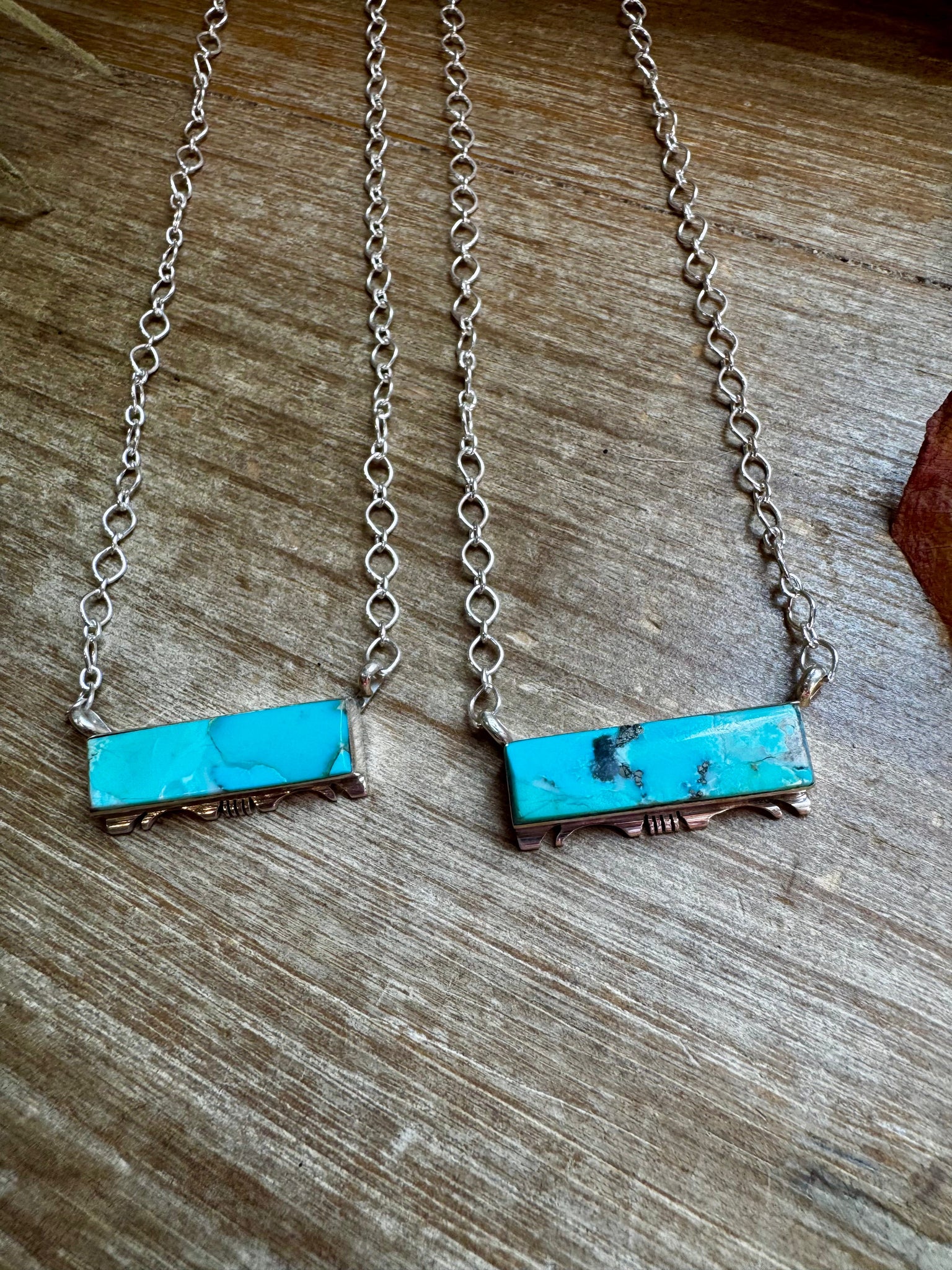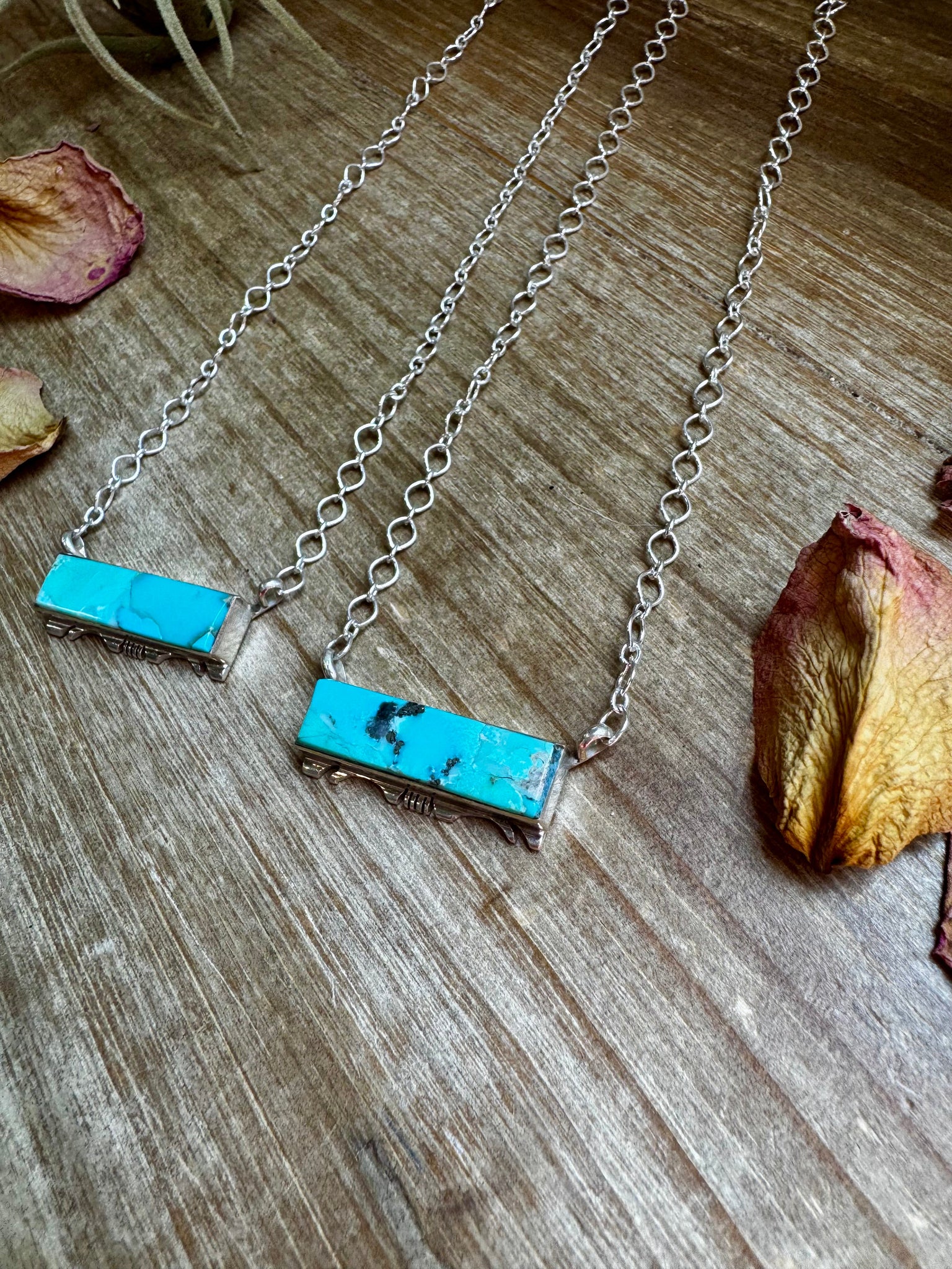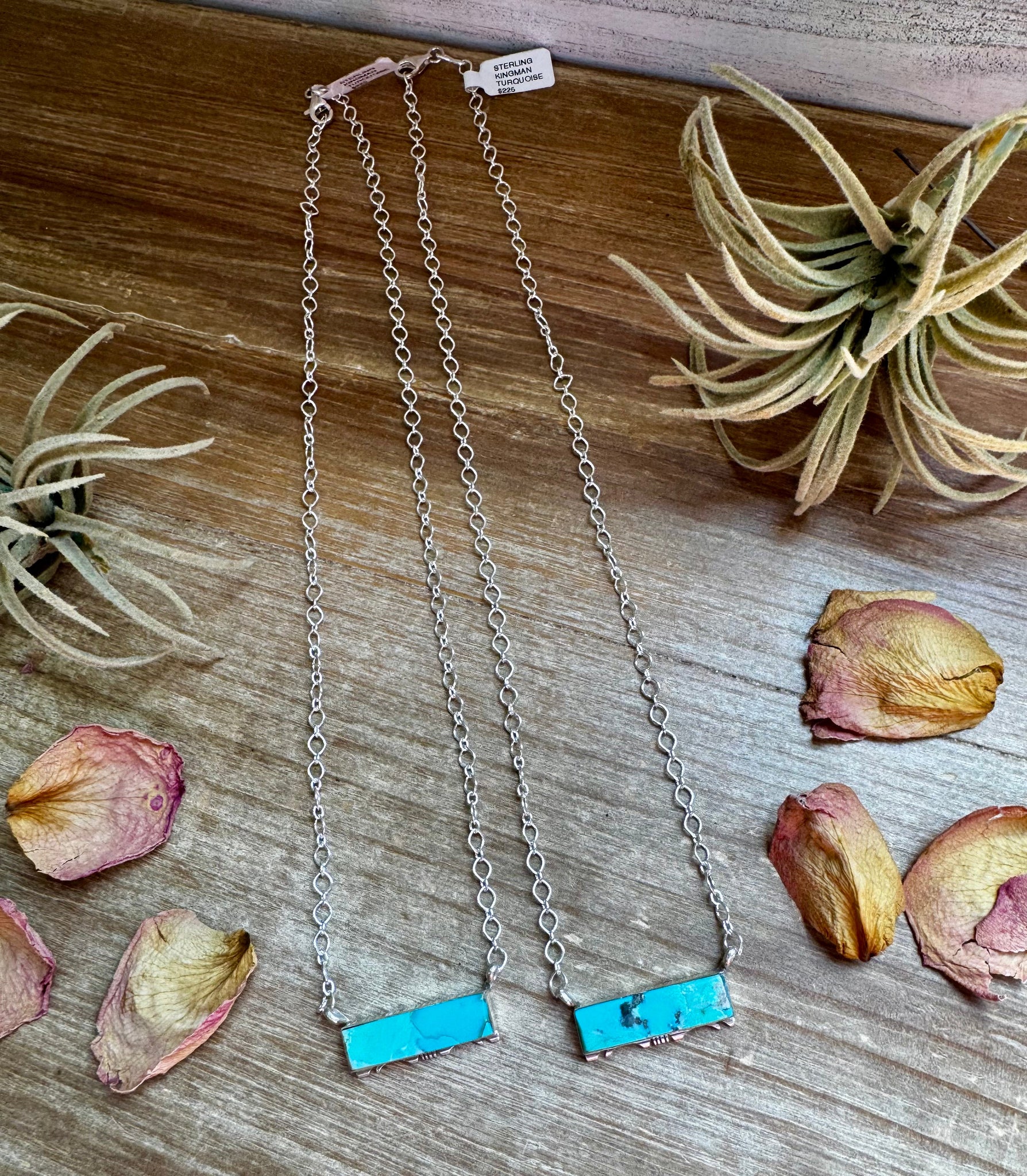 This 20-inch necklace is handmade by Navajo silversmith Steve Francisco, featuring genuine Kingman turquoise set in solid sterling silver. The design is stamped on the back for authenticity, and we only have two options available—each one unique.