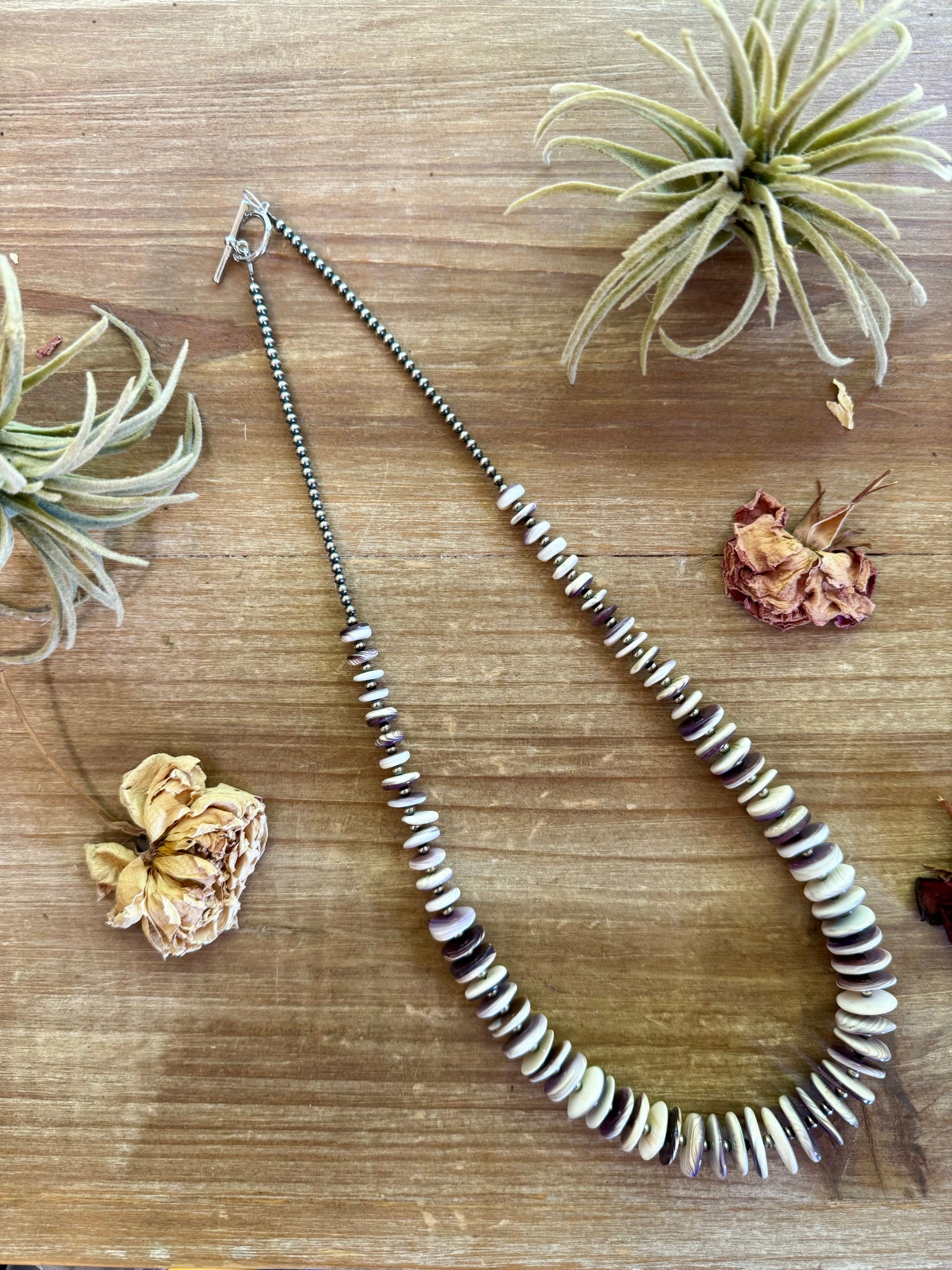 • Load image into Gallery viewer, 22 Inch purple Wampum shell and sterling silver pearls
