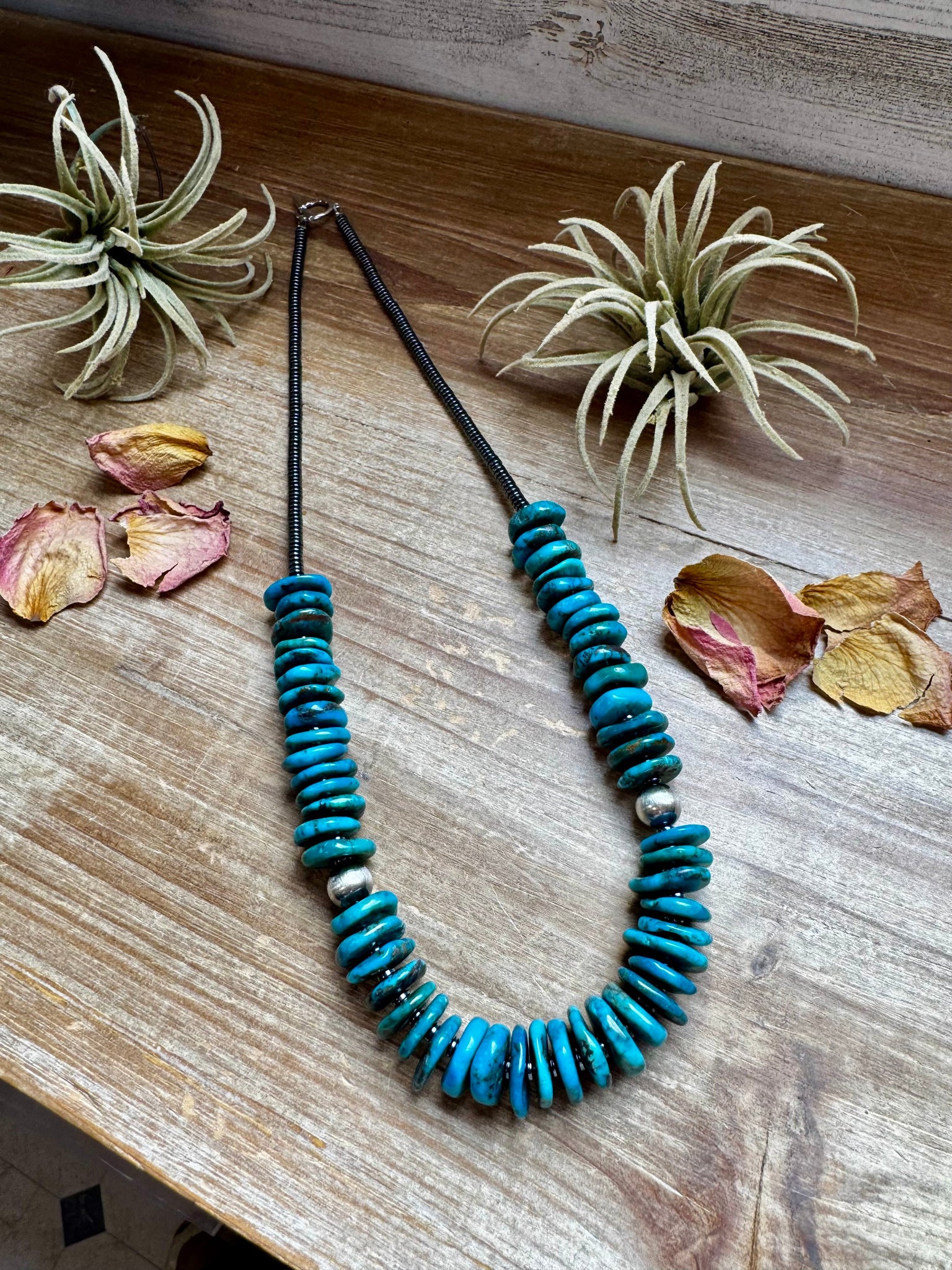 This 23-inch necklace is all about that deep, rich blue turquoise—bold, rare, and unforgettable. Each piece features 10mm turquoise beads on each side, spaced with dark hematite for contrast and depth.