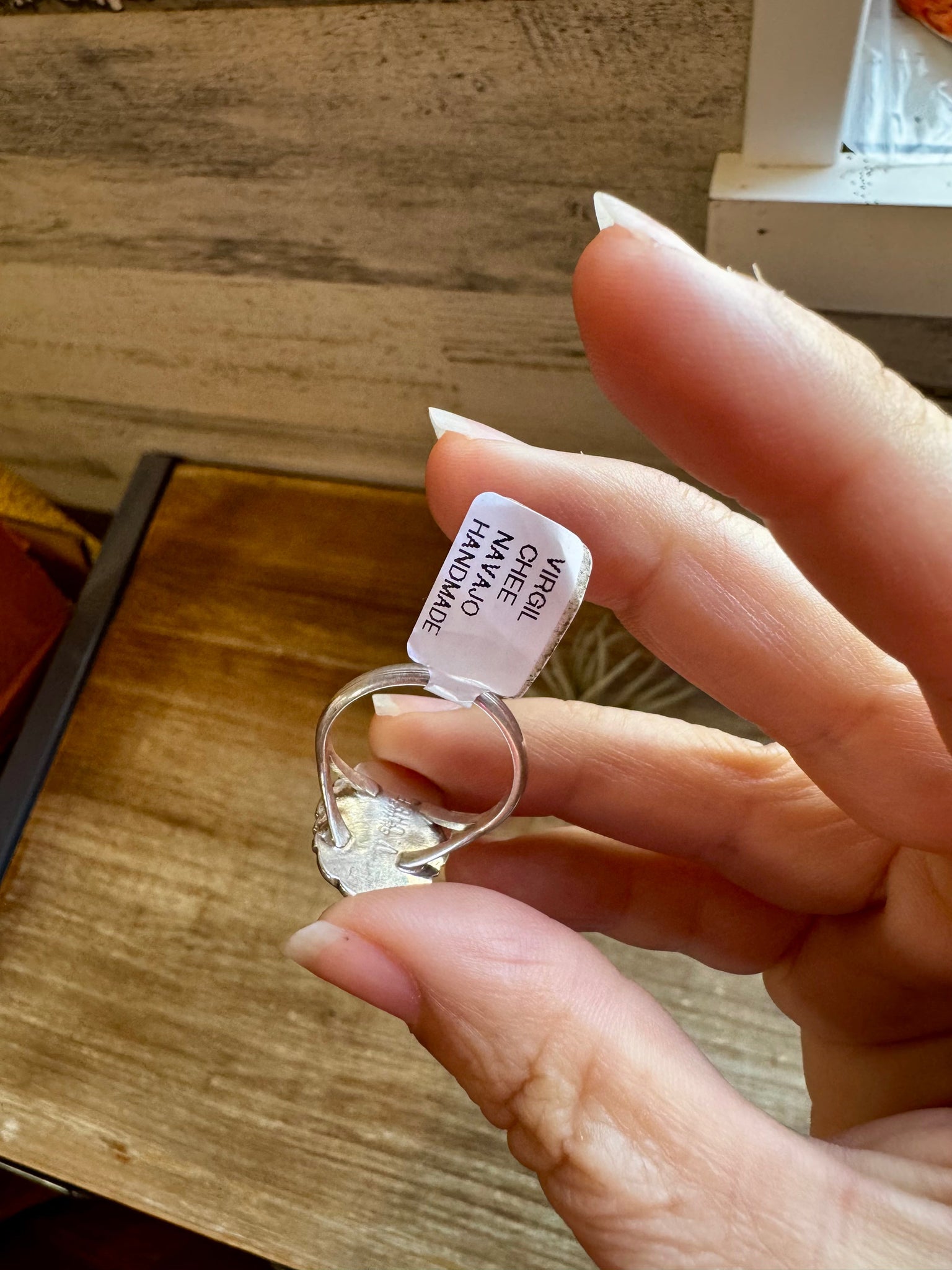 This stunning Golden Hills turquoise ring is handmade by Navajo silversmith Virgil Chee. Set in solid sterling silver, it’s a size 8.5 and showcases the soft, dreamy blues that make Golden Hills turquoise so rare and beautiful.