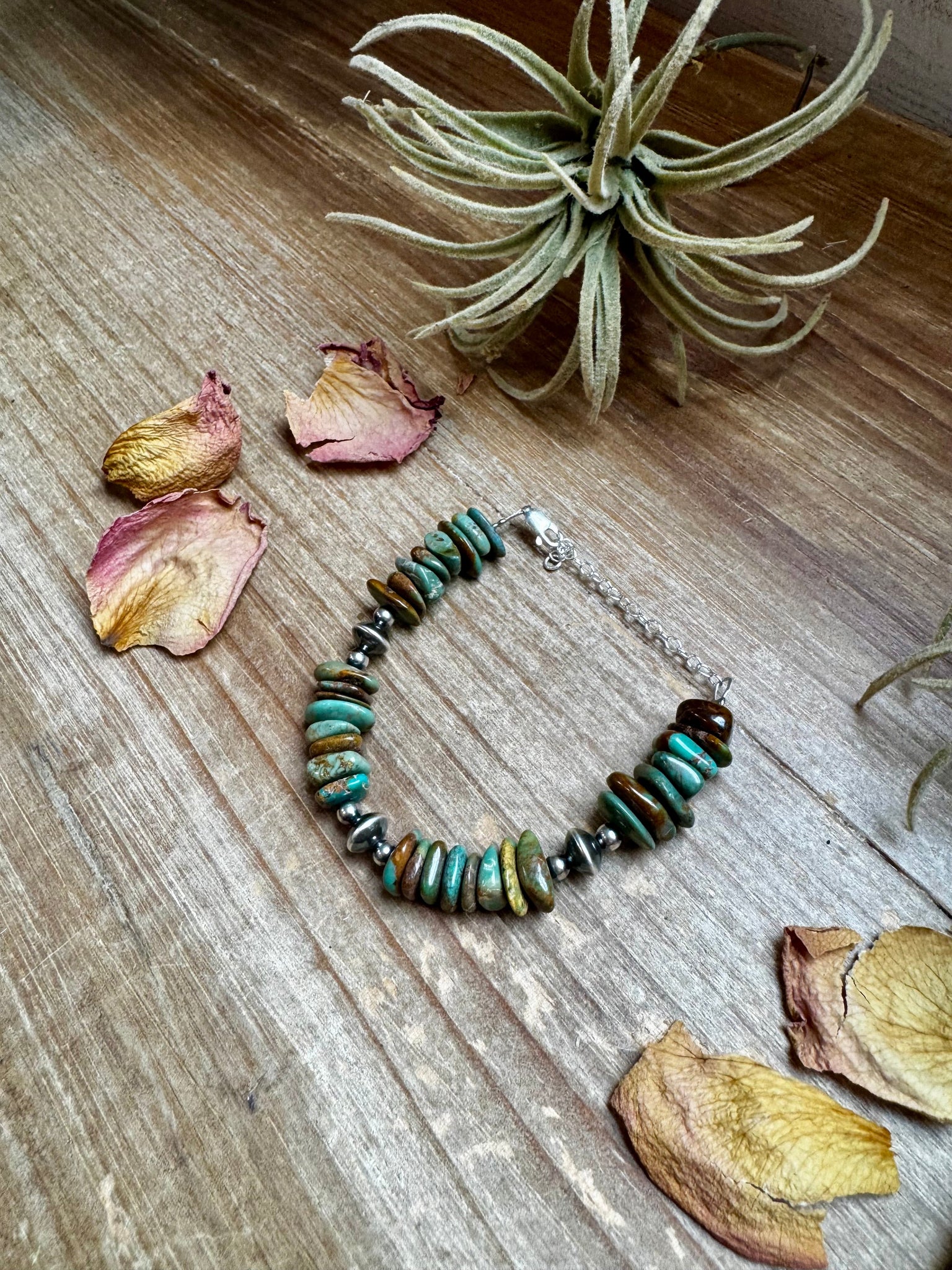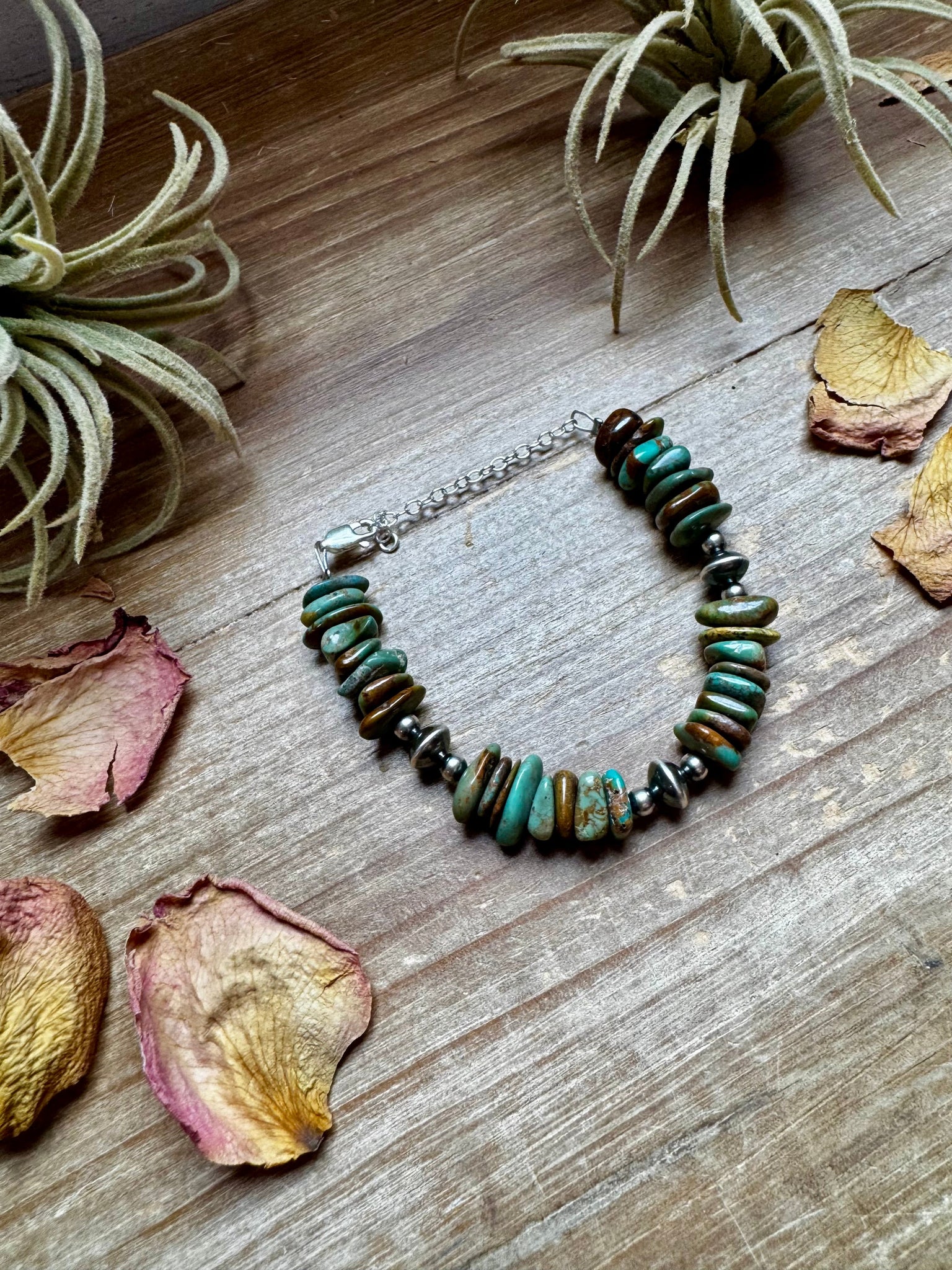 This handcrafted bracelet features chunky green turquoise chips full of earthy character, spaced with 4mm sterling silver beads and finished with 3 sterling silver saucers for extra shine.