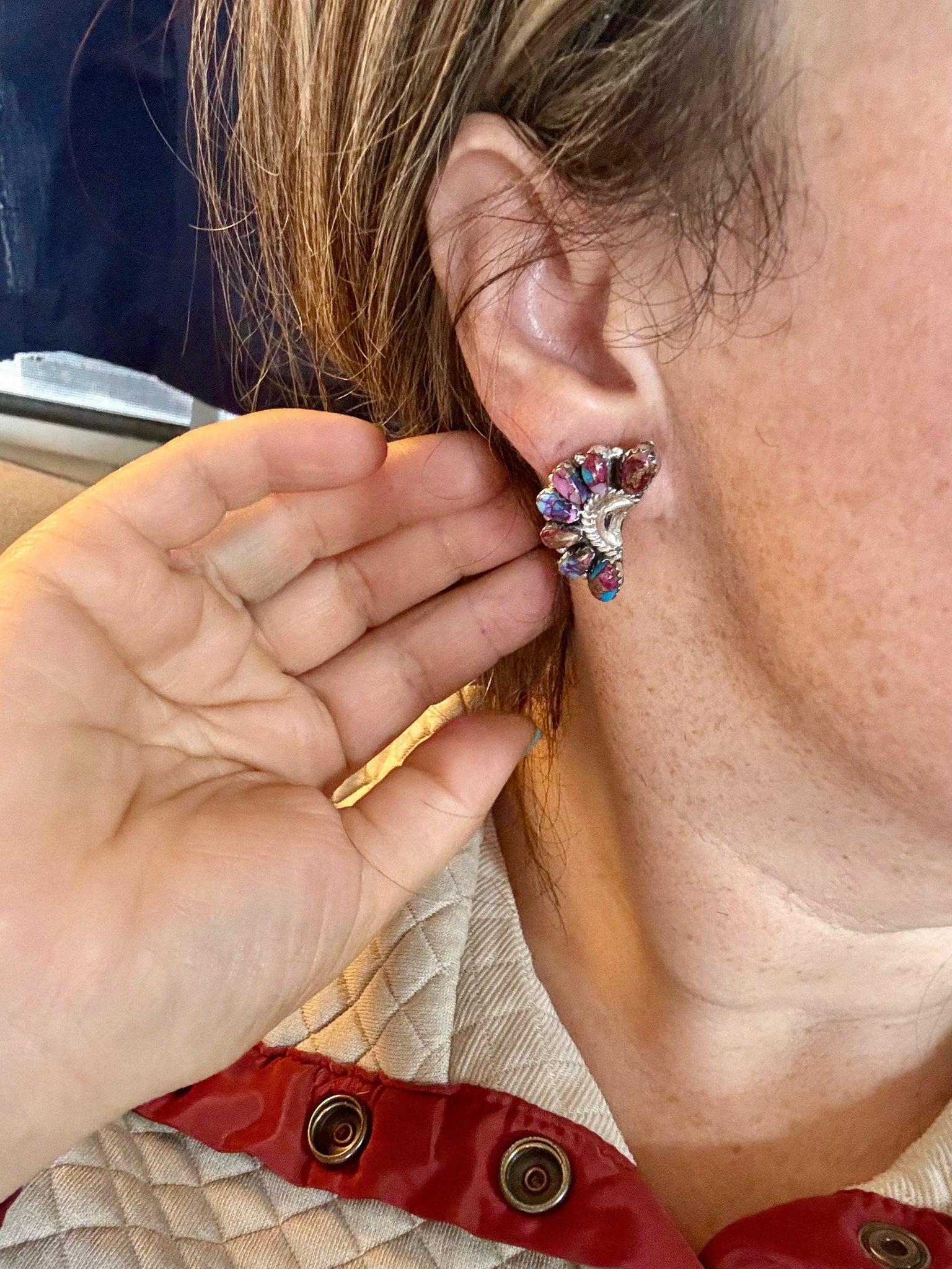 These handcrafted half cluster earrings feature vibrant pink dahlia set in solid sterling silver. Stamped JW (see photo) and made in the USA, each pair is truly unique—full of rich color and classic western charm.