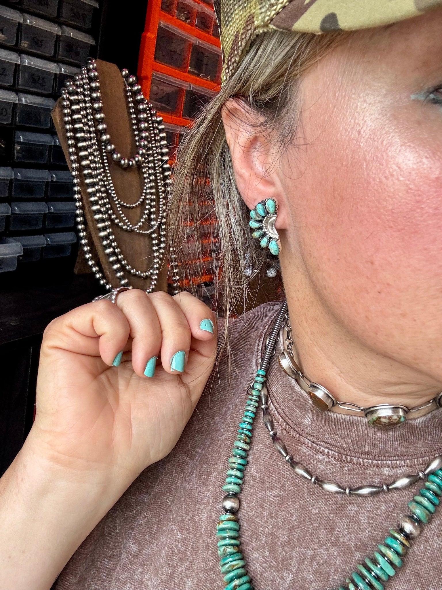 These handcrafted turquoise half cluster earrings are made with genuine turquoise stones and solid sterling silver. Stamped with LW (see photo), each pair showcases the natural beauty and one-of-a-kind character of turquoise—no two are exactly alike.