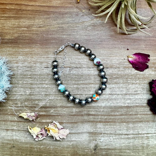 8 mm Sterling Silver Pearls bracelet with Mohave beads