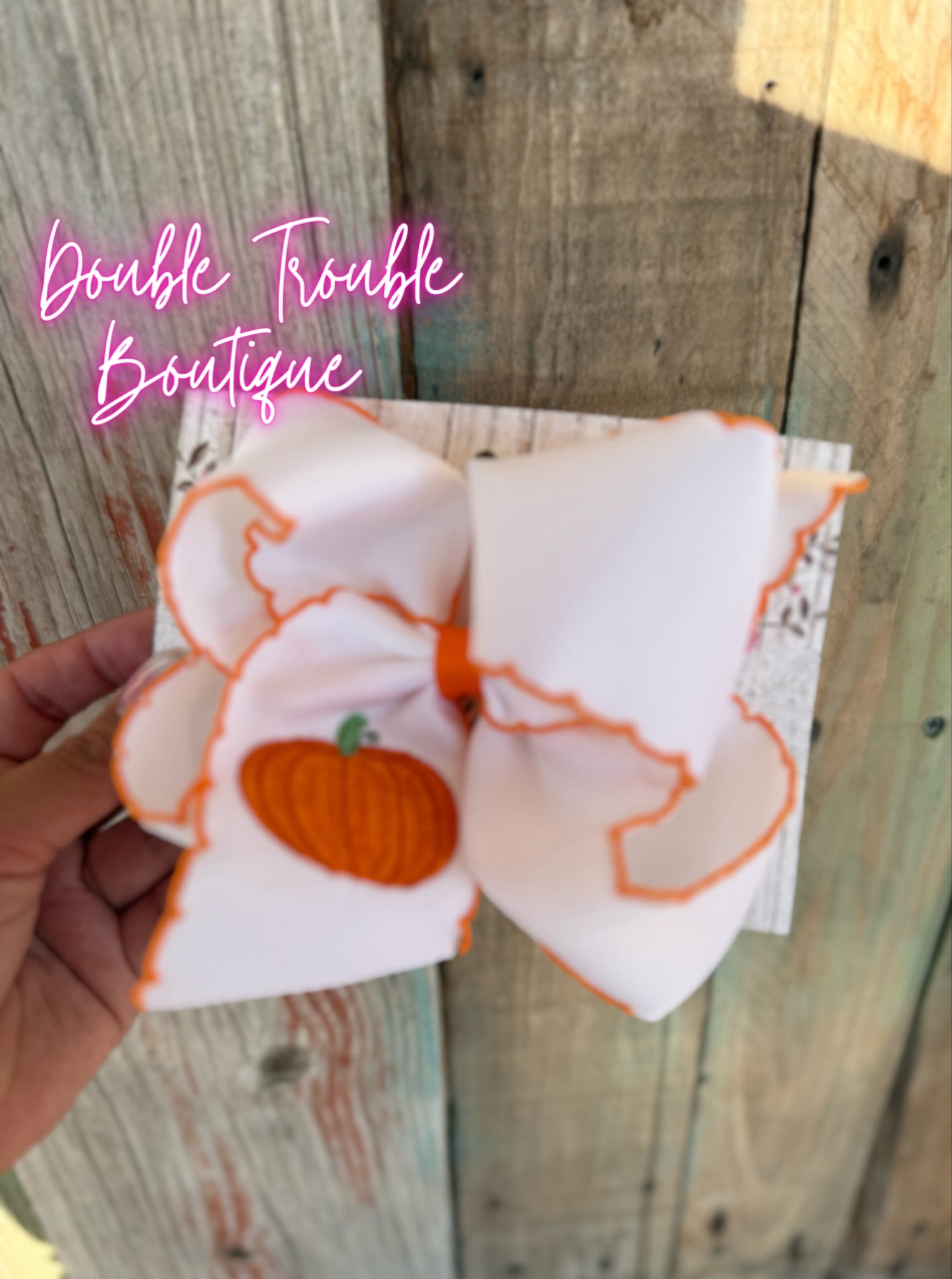 EMBROIDERED PUMPKIN WHITE BOW- 5 INCH