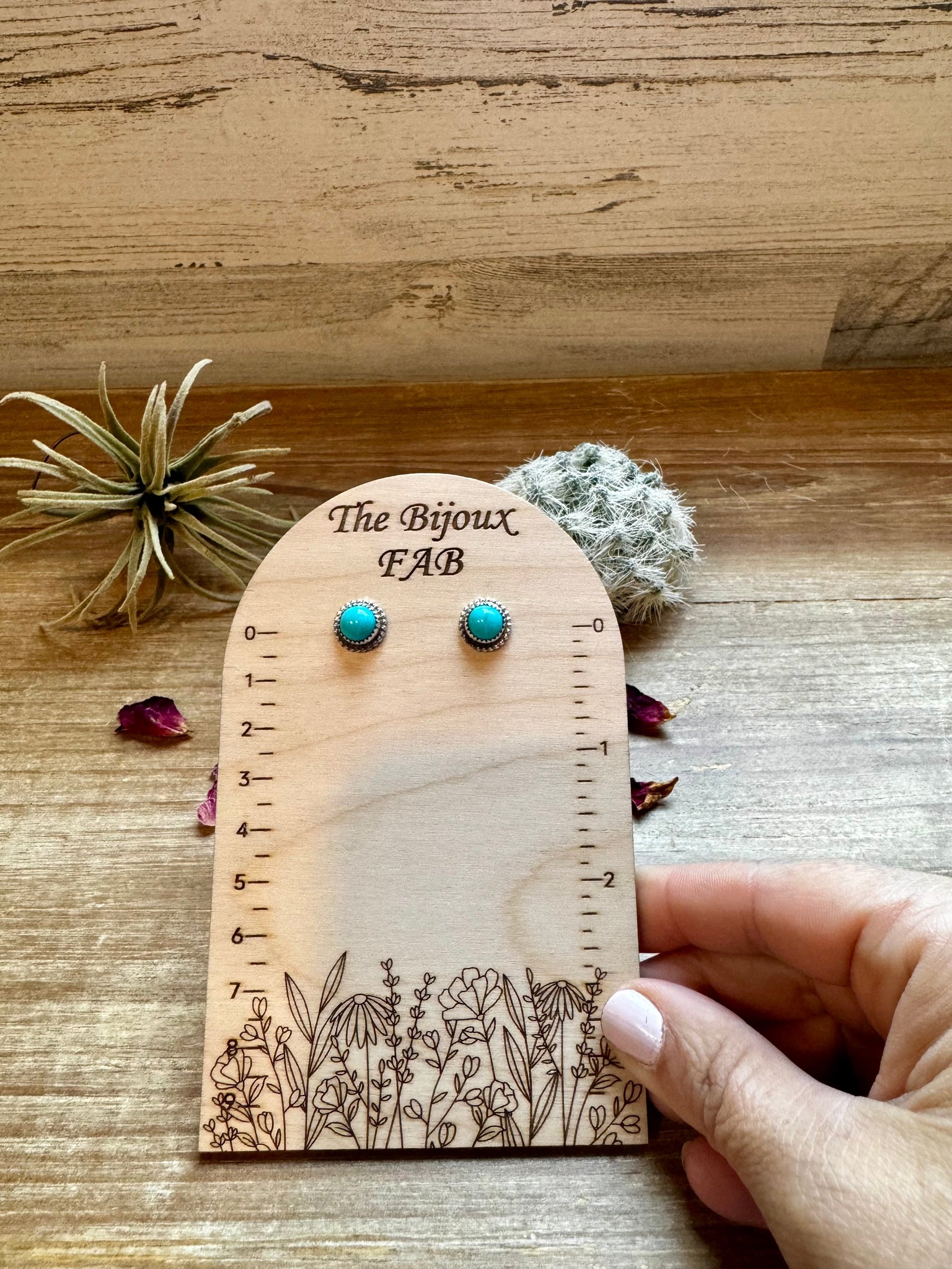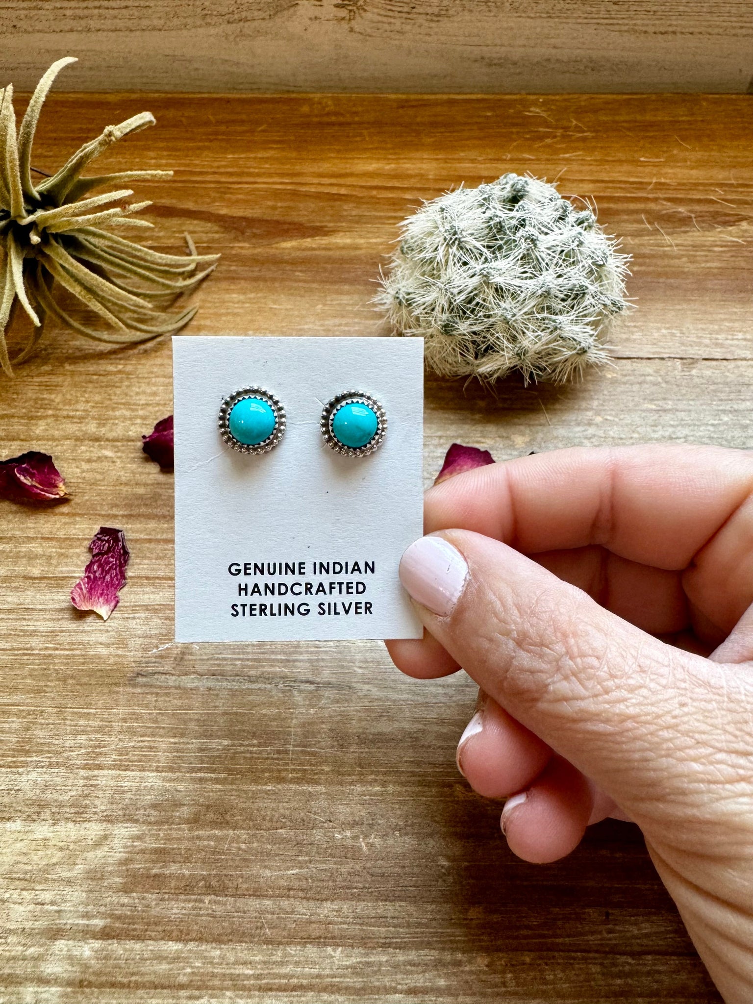 Simple, bright, and full of character. These sterling silver Kingman turquoise stud earrings are handmade by Native artisans in the USA. Each pair is slightly different—no two stones are the same—adding to their charm and authenticity.